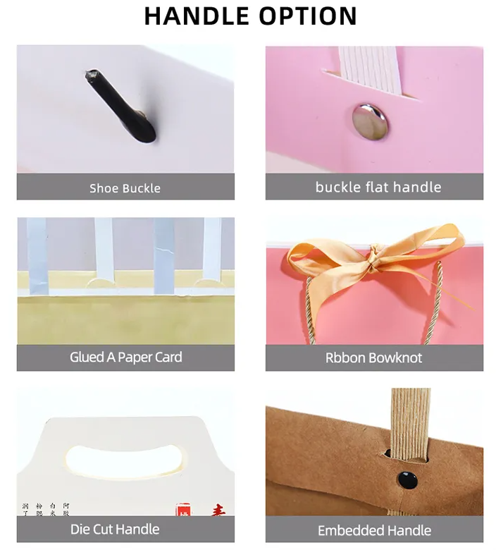 Ribbon Handle, PP Rope Handle, Cotton Handle, Grosgrain Handle, Nylon Handle, Twisted Handle, Flat Paper Handle, Die-cut Handle or